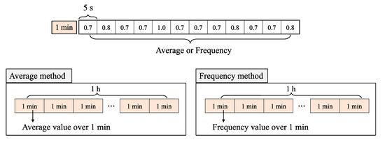 The activity-decision algorithm is designed to determine the representative activity from the data accumulated for a certain period of time by the pose-categorization model. Two methods are used to identify the representative activity: (1) the frequency method and (2) the average method. For the real-time dataset, images are collected once every 5 s for 1 h. This dataset is used for evaluating the algorithm in the cases of the two aforementioned methods. As shown in Figure 6, the representative value of the accumulated pose for 1 min is calculated using average and frequency values, and the results are compared to determine the method that is more appropriate to be applied to the algorithm. For the comparison, the activities derived from the pose-categorization model are replaced with the corresponding metabolic-rate values of each activity from Table 5.2.1.2 provided by ASHRAE 55 (2017). The algorithm that more closely matches the metabolic rate of the actual activity is selected.