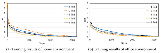 Figure 7 shows the training-cost results of the model with five different valid datasets. Figure 7a,b corresponds to the models trained for home and office activities, respectively. There was a difference in the speed at which the training converged, but after approximately 2000 steps, all five training cases indicated a cost close to zero. This suggests that all the models were trained well, without overfitting.