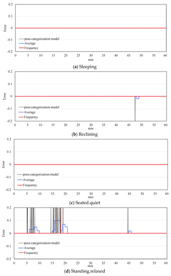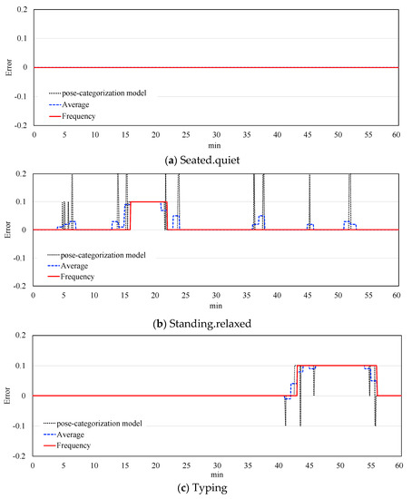 To identify the method that is better for determining the representative activity, the metabolic rates obtained every minute using the two methods—frequency and average—were compared for 1 h. Figure 9 and Figure 10 show the errors of the two methods and the pose-categorization model for home and office activities, respectively. Here, the values of the pose-categorization model represent the results of the model without manipulation such as value-averaging or representative-value selection. Table 4 compares the accuracies of the average and frequency methods.