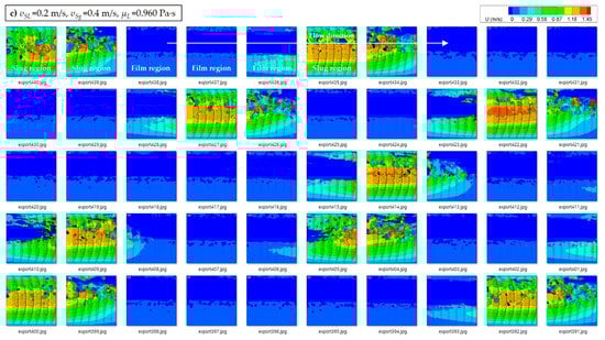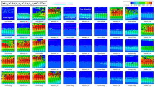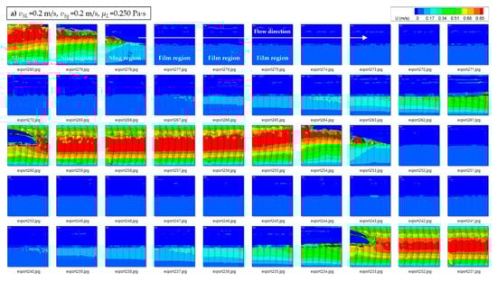 The authors argued low velocity of the liquid film (vLTB ≈ 0 and τF,G ≈ 0) with negligible accelerational pressure gradient (∆pMIX ≈ 0). The inner velocity field measured by Kim et al. [2] utilizing particle image velocimetry (PIV) also supports the postulation of low velocity of the liquid film, neglecting the pressure loss of liquid film. Kim et al. [2] performed the experimental study with 0.250 Pa∙s ≤ μL ≤ 0.960 Pa∙s for horizontal 50.8-mm (2-in.) ID pipe and laminar flow conditions. The in-situ velocity profiles at the center of pipe cross-section were measured and analyzed in liquid phase only. The measured velocity fields illustrate that the velocity of the liquid film is close to zero (or much slower than the liquid slug body), especially near the inner pipe wall (see Figure 2). It should be noted that the consecutive images of slug bodies in Figure 2 have some discontinuities caused by the limited laser frequency of the PIV system.