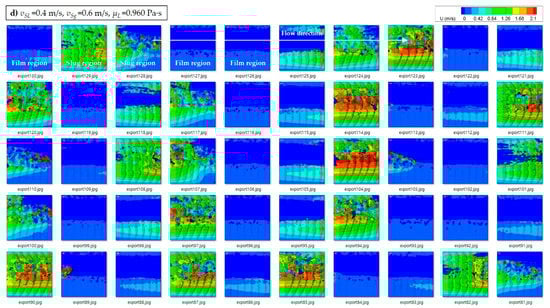 Velocity vector fields in axial direction with different operating conditions; (a) vSL = 0.2 m/s, vSg = 0.2 m/s, μL = 0.250 Pa∙s, (b) vSL = 0.4 m/s, vSg = 0.6 m/s, μL = 0.510 Pa∙s, (c) vSL = 0.2 m/s, vSg = 0.4 m/s, μL = 0.960 Pa∙s, and (d) vSL = 0.4 m/s, vSg = 0.6 m/s, μL = 0.960 Pa∙s [2].