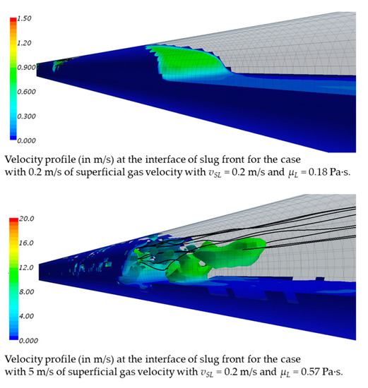 Recently, Kim [13] reported that shorter slug length might cause the pseudo-slug flow at relatively lower mixture velocity conditions as liquid viscosity increases. The author presented the computational fluid dynamic (CFD) result of Pineda et al. [34], indicating that the gas is blowing in the upper part of the slug body. Then, the liquid does not generate a hydraulic sealing between the tail and the front of the slug, generating unstable slug body or so-called the pseudo-slug flow (see Figure 4). In the current study, the data sources of pressure gradient include the pseudo-slug flow (typically when vM ≥ 5 m/s), and the proposed model shows suitable agreements with them as will be presented in Section 3. However, a more rigorous analysis and modeling study will be required in future studies to understand the pseudo-slug flow mechanistically, considering its length scale. It should be noted that the proposed model postulates that the system temperature is constant following the axial direction of pipe, so the viscosities of each phase are constant.