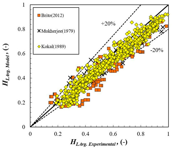 In the case of the flow coefficient, Co, which needs to be optimized to calculate vLLS in Equation (14), several different correlations of translational velocity are compared to the previously obtained experimental data. Table 1 and Table 2 summarize the experimental dataset and the compared correlations, respectively, to optimize the proper value of Co. The model of Choi et al. [36] requires the proper correlation of gas void fraction. Woldesemayat and Ghajar [37] improved the correlation of gas void fraction by Dix (Coddington & Macian [38]), validating it with a very extensive number of data, i.e., 2845 experimental points, as given in Equation (16). This model shows a good match, < 8%, with the measured average liquid holdup (HL Avg.) data obtained by Brito [11], Mukherjee [29], and Kokal [30] (see Figure 6). These data were not verified by Woldesemayat and Ghajar [37], previously. Therefore, their correlation is utilized to calculate the average gas void fraction in this study.