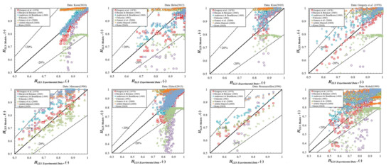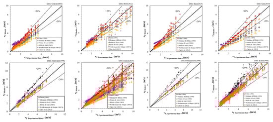 Table 5 and Table 6 summarize the evaluation results of the best correlations in different experimental datasets. Figure 7 and Figure 8 illustrate the comparisons between experimental data and predicted values calculated by the correlations.