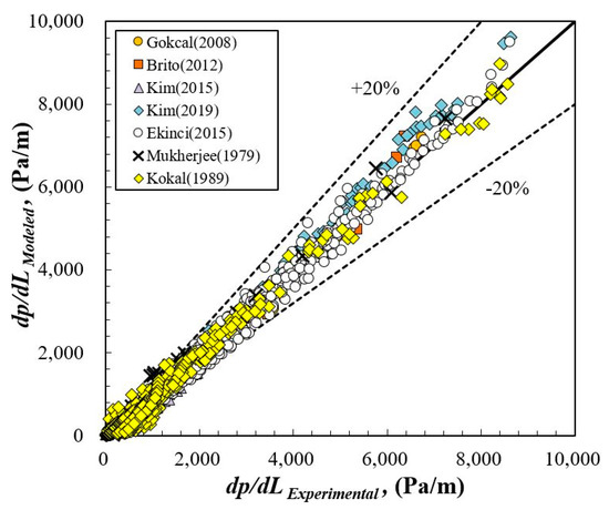 This section presents the performance of a modified and optimized slug flow model. The dp/dL experimental data measured by Gokcal [10], Brito [11], Kim [27] and [13], Ekinci [28], Mukherjee [29], and Kokal [30] are utilized to evaluate the performance of the model. The suitable correlations of Co (vT) and HLLS that are statistically selected in Section 2 are used to calculate dp/dL with Equation (14). The slug liquid holdup data were not measured by Gokcal [10] and Kim [27]. Therefore, the correlation of Gregory et al. [22] which shows the best agreement with the data of Brito [11] and Kim [13] is adopted for Gokcal [10] and Kim [27]. In the case of Mukherjee [29], both measurements of vT and HLLS were missed. Alternatively, the correlations of Fabre [6] and Gomez et al. [43] that present a good agreement with the data of Marcano [26] are used to calculate dp/dL. The fluid properties of Mukherjee [29] and Marcano [26] are similar as both of them used Kerosene for the liquid phase. Table 7 summarizes the pressure gradient dataset with chosen correlations for Co and HLLS.