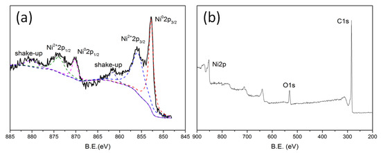 Characterization of the 20% Ni/CNT catalyst. (a) XPS of Ni 2p, (b) XPS pattern of 20% Ni/CNT.