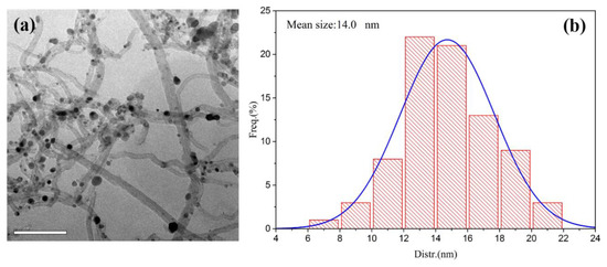 Characterization of the 20% Ni/CNT catalyst. (a) TEM image of 20% Ni/CNT, (b) Distribution of Ni particles.