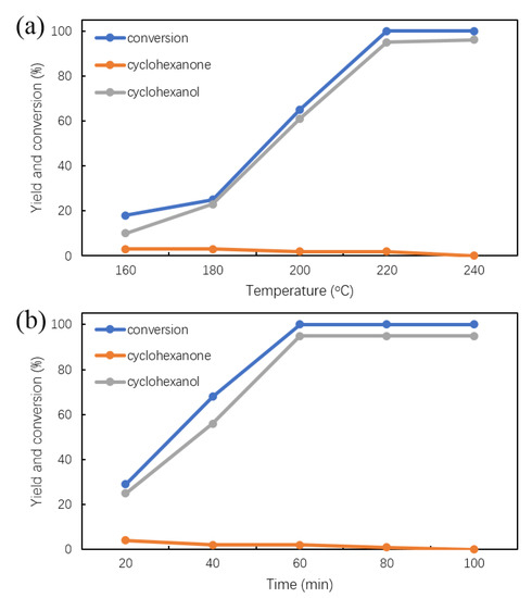In addition, reaction temperature and reaction time were important key factors for the transformation of phenol (Figure 4). As shown in Figure 4a, the conversion of phenol progressively increased when the reaction temperature increased from 160 to 220 °C, and phenol could almost totally transfer to cyclohexanol at 220 °C with a reaction time of 60 min. In the catalytic process, the dominant products were cyclohexanol, with a small amount of cyclohexanone detected in the GC/MS. As the temperature continued to rise, the yield of cyclohexanol kept around 95%. Subsequently, it could be found that the conversion of phenol increased with the prolonging of the reaction time (Figure 4b), and the phenol was completely consumed in only 60 min at 220 °C. With the prolonged reaction time, the yield of cyclohexanol increased when the reaction time increased from 20 to 60 min. When the reaction time exceeded 60 min, the conversion of phenol achieved 100%, and the yield of cyclohexanol kept at the highest point. Through the screening of temperature and time of the hydrogenation of phenol, the optimal temperature and time could be summarized as 220 °C and 60 min, respectively.