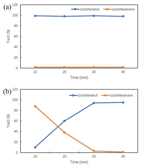 Time course of the yield of cyclohexanol carried out in the transfer hydrogenation (a). Time course of the yield of cyclohexanone carried out in the transfer hydrogenation (b).