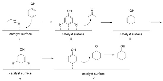 Cyclohexanol is an important chemical raw materials, for example, it could be used as the main intermediate for the production of adipic acid, hexamethylene diamine, cyclohexanone, and caprolactam, or as an excellent solvent for rubber, resin, nitro fiber, and metal soap [1,2,3,4,5]. Except for this, its downstream product, cyclohexane, can also be converted into various useful chemicals [6,7,8]. Hence, the production of cyclohexanol has attracted increasing attention, both in industry and in the laboratory, recently. In the past several years, tremendous efforts have been devoted to the hydrogenation of phenol for the generation of cyclohexanol. The main pathways can be classified into two groups, gaseous [9] and liquid phase [10]. In the gaseous phase, a variety of supported noble metals, such as Pd [11,12], Pt [13,14], Ru [15,16], Rh [17,18], have been reported to be effective in the hydrogenation system. For example, Wang et al. reported a hierarchically porous ZSM-5 zeolite with micropore and b-axis-aligned mesopore-supported Ru nanoparticles (Ru/HZSM-5-OM), which were highly effective for the hydrogenation of both phenol and its derivatives to the corresponding cyclohexane [15]. However, elevated temperature and high pressure of hydrogen (150 °C, 4 MPa) were required, and carbonaceous deposits in the process would result in the deactivation of catalyst. In the liquid phase, although the hydrogenation process could be performed under a relatively lower temperature [19], the main shortcoming of recent hydrogenation systems is that they could not avoid the presence of hydrogen [20]. For instance, Li et al. developed a series of Pd@FDU-N catalysts for the hydrogenation of phenol in the presence of 0.1 MPa H2 [21]. Therefore, the exploration of a cheap and effective catalyst for the hydrogenation of phenol in the absence of hydrogen is essential. Catalytic transfer hydrogenation (CTH) has been regarded as a good alternative to avoid the application of high-pressure hydrogen [22,23,24,25]. Galkin et al. reported that Pd/C could catalyze transfer hydrogenolysis of β-O-4 model compound in lignin employing formic acid as a hydrogen-donor for the generation of acetophenone and phenol derivatives [22]. Paone et al. reported the transfer hydrogenolysis of α-O-4 model compound in lignin conducted on Pd/Fe3O4 under 240 °C [23]. Wu et al. found that Ru/C could efficiently catalyze the cleavage of the 4-O-5 aromatic ether bond in a variety of lignin-derived compounds through the transfer hydrogenolytic pathway using isopropanol as the hydrogen-donor solvent [24]. Despite those achievements for the transfer hydrogenolytic transformation of biomass to value-added chemicals, the catalytic hydrogenation without the use of external hydrogen remains a great challenge [25,26].