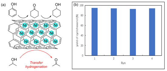 (a) Possible catalytic pathway in the transfer hydrogenation of phenol. (b) Result of recycling tests for Ni/CNT catalyst in the transfer hydrogenation of phenol.