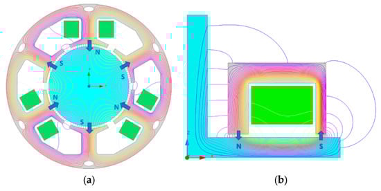 The radial AMB magnetic configuration remarkably affects the cost, the driving circuit scheme, the control strategy, and the efficiency. As an example, Figure 1a shows a six-pole configuration, which is particularly convenient, as it enables the usage of a three-phase converter avoiding cross-coupling effect between the controlled axes []. However, because of heteropolar design, the power consumption is relevant due to the rotor losses determined by the flux variations along the stator circumference. This effect can be reduced using a homopolar design (Figure 1b), where there is no change of the flux polarity. In addition, they can control two degrees of freedom, reducing the number of power amplifiers []. This can benefit mostly the axial AMBs, which are demanded to generate high flux density to support the FESS rotor mass. Additional advantages derive from hybrid configurations provided by both PMs and supplied coils. The PM generates the static suspension force to keep the rated flywheel position, whereas the coils provide the supplementary force components in case of force unbalance related to a parameter’s variation or other disturbances.