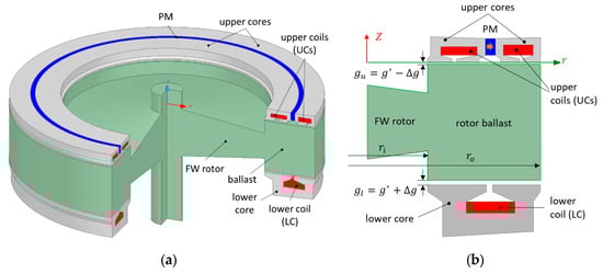 Configuration of the axial hybrid magnetic bearing integrated with the flywheel structure; (a) 3D view with split sections; (b) 2D section evidencing the axial hybrid magnetic bearing (AHMB) active parts.