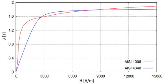 Therefore, a rare earth PM material is considered having the properties shown in Table 1. The coefficient describes the influence of temperature of and . The ferromagnetic cores are assumed solid with the properties of a low carbon steel AISI 1008. Its characteristic is compared to AISI 4340 steel, evidencing the higher permeability and saturation flux density. With respect to the use of laminations or soft magnetic composites, the adoption of a solid core ensures adequate mechanical stiffness, easier manufacturing, and lower production costs, without detriment to the magnetic properties.