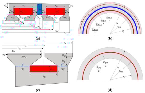 - equal annular cross section of the core legs (h = 1, …, 4) for the upper side and (j = 1,2) for the lower side; and are decreasing factors to enable enough room for the coil placement; their choice must consider local magnetic saturation, even with the coil mmf contribution;