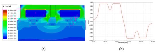 Flux density in the upper AHMB side with no excitation ( 2 mm, 0); (a) map of the magnitude; (b) axial component in the air-gap.