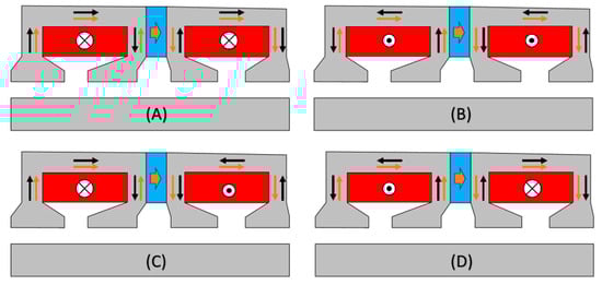 Possible upper coil (UC) supply strategies with concordant (A,B) or discordant (C,D) current polarities; the orange and black arrows indicate the permanent magnet (PM) and coil flux directions, respectively.