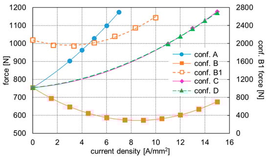 Figure 7 shows the resulting axial force as a function of the current density. The supply strategy A is clearly the most efficient, as it allows for the target force achievement at the lowest current density (, corresponding to a total ampere-turns 460 A for each coil).