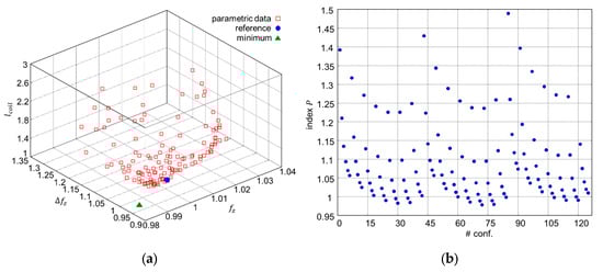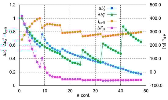 Figure 8a compares the quantities (7) for 126 configurations defined in the ranges and , considering as reference configuration the one obtained from the preliminary analysis. It is worth remarking the very limited improvement in the p.u. forces, while the p.u. inductance has a large variation. As no configuration approaches simultaneously the minimum value for all the quantities, a performance index is defined to achieve a global ranking by its minimization. This index is expressed as a weighted function, which integrates the performances described by (7):