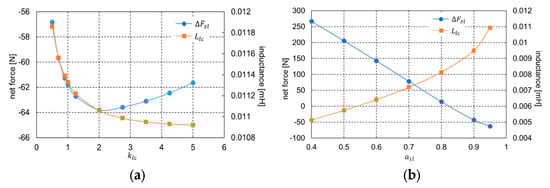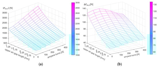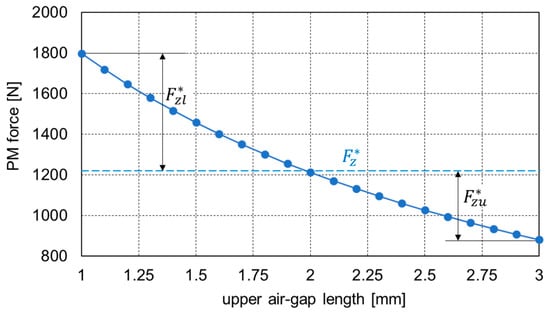Figure 9 shows the resulting PM force with no excitation as a function of the air-gap length . The nonlinear dependence on with a steeper increase as can be noticed. This behavior will result in higher loading for the LC since it must generate a balancing force with the air-gap variation being the same. However, this is not an issue because the AHMB lower side allows for an easier coil placement as no PM is present.