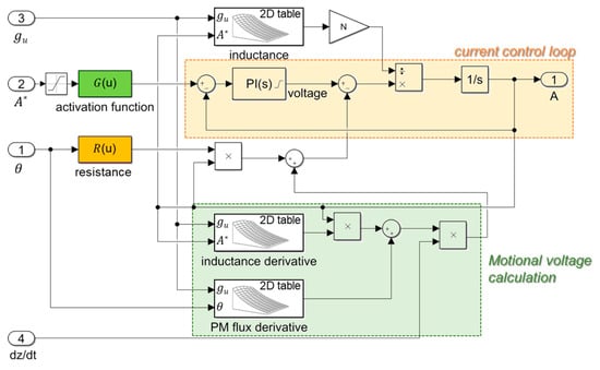 The latter property can be used to develop a two-degrees control or to supplement the action of dedicated radial AMBs, which are, however, needed for the full stability control of a five-degrees-of-freedom system. An auxiliary mechanical bearing (backup bearing) at the bottom end is, however, needed to support the rotor in the stationary condition or to enable a safe shutdown during a system fault. Both radial MBs and the auxiliary bearing are not represented in Figure 2, as they must fulfill typical arrangements adopted for different FESS applications [,]. It is worth pointing out that the configuration in Figure 2 is more convenient than the one analyzed in [], because the use of a single PM simplifies its installation, and the double coil assembly allows a better magnetic utilization of the upper cores.