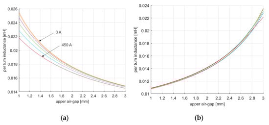 The above conditions (a)–(g) lead to the definition of five independent variables related to the pole shoes’ coordinates and to the PM sizes. This condition would require too wide an exploration, especially if more performance parameters are to be evaluated with and without excited coils. Therefore, the design of the AHMB upper side has been developed in two steps. The former determines the PM geometry to achieve a predefined air-gap flux density, which fulfills the force target and avoids excessive magnetic saturation in the core yokes. The latter performs a parametric analysis to determine the more convenient widths of the core poles to optimize some performances related to the axial forces, as well as to the winding inductances.
