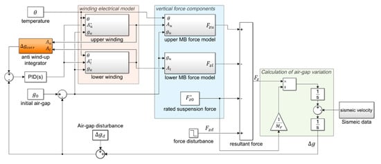 Afterward, the implementation of the AHMB nonlinear electromagnetic model in a numerical code for the dynamic analysis addressed the tuning of the regulator parameters related to the axial force control. The simulation results concerning different types of disturbances evidence the control system promptness without excessive oscillations for both the air-gap and the coil currents. In particular, the validity is demonstrated of the current control technique which manages efficiently the upper and lower bearing supply to enable separate excitation between the two circuits during transients as well as no excitation at steady-state. This behavior is confirmed also in the presence of a high-stress condition like a seismic event, indicating the suitability of the proposed AHMB for practical applications.