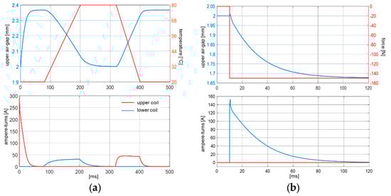 Dynamic progress of the air-gap and of the coil ampere-turns; (a) trapezoidal time variation of the temperature between and ; (b) step force disturbance 150 N.