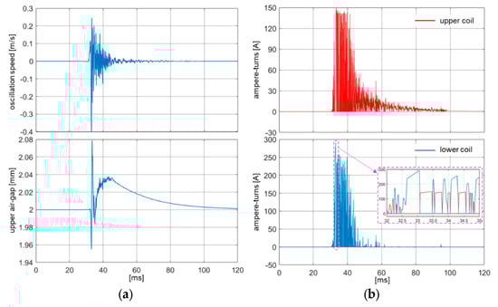 Simulation results of a seismic event; (a) oscillation speed and upper air-gap variation; (b) upper and lower coil ampere-turns (dotted box: zoomed interval on ampere-turn variation).