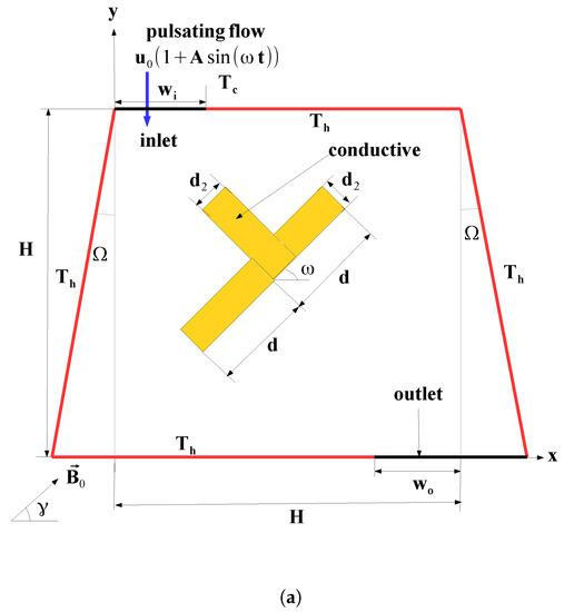 In this study, magneto-hydrodynamics (MHD) mixed convention in a ventilated cavity under pulsating flow conditions were examined in the presence of a conducive T-shaped obstacle within the cavity. The complicated nature of occurrence of multiple recirculation regions and coupling of thermo-fluid interactions with natural convection effects and other effects such as magnetic field and solid conducting body within the system makes those systems very hard to treat theoretically. Therefore, numerical simulations were used to perform such a study. In the literature, there are a few studies that deal with the application of pulsating flow with magnetic field effects [54,55,56]. The novelty of the study can be listed as below: (i) It included a conductive T-shaped object within the cavity, which can generate many vortices near the object and affect the heat transfer features. (ii) Magnetic field effects were used in the vented cavity with flow pulsation effects. Even though there are some studies with the pulsating flow in vented cavities, the use of magnetic field, which has the potential to redistribute the separated flow regions within the vented cavity, adds novelty and the method has many control parameters and applicability for many thermal engineering systems, as mentioned above. (iii) Highly conductive CNT nanoparticles were used with water and heat transfer rates were expected to enhance significantly. (iv) The cavity had a trapezoidal shape, which includes geometrical complexity and effects of side wall inclination angles were considered.