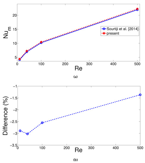 To assure mesh independence, numerical simulation tests with different grid sizes are performed. The grid was very fine towards the walls of the cavity and in the vicinity of interface between the solid and fluid domains while Figure 1b shows the mesh distribution. Table 1 shows the results of grid independence studies for various values of Ri and Ha number combinations considering all hot walls of the cavity for fixed values of Ri = 1, Ha = 10, = 10, = 45 and . Grid type G4 with 12,814 elements was used. Then, 1/50 of the period of oscillation () was chosen as the time step () for the unsteady calculations. Validation was performed by using different available studies in the literature. In the first validation study, the results of Sourtiji et al. [64] were utilized where mixed convective heat transfer in a vented cavity with different locations of the outlet port was examined. The companion results of average Nu versus Reynolds number for Ri number of 10 is shown in Figure 2. The difference in percentage in Figure 2b was defined as the discrepancy of the reference average Nu values obtained by Sourtiji et al. [64] as compared to average Nusselt numbers obtained with the present code. In another validation, magnetic field effects for the free convection in a square cavity were used [65] and Table 2 gives the average Nusselt number comparison results considering various values of Rayleigh number when Hartmann number is fixed to 30. The highest deviation was seen for Ra = 10 and the value is −1.34%. The present solver is capable of solving problems in vented cavity with magnetic field effects.