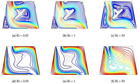 Effects of Richardson number on the distribution of streamlines (a–c) and isotherms (d–f) (Ha = 20, = 45, 45, ).