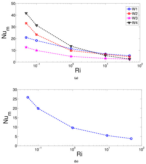 Average Nusselt number variations with respect to changes in Richardson number for individual walls (a) and for all walls (b) (Ha = 20, = 45, 45, ).