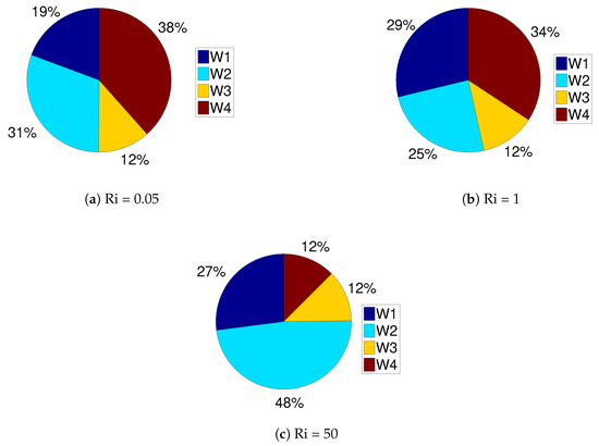 Impact of Ri number on the flow and thermal patterns are shown in Figure 3. A lower value Ri number gives a higher velocity of the incoming fluid since the Rayleigh number was fixed to Ra = 10 in the simulations. Multiple re-circulations were established in the cavity and near the T-shaped object. As the value of Ri number was increased, vortices near the T-shaped object first disappeared at Ri = 1 and then enlarged in size for Ri = 50. The extent of the vortex below the inlet port increased at Ri = 50, where forced convection effects were weak. Temperature gradients near the hot walls decreased with higher values of Ri number since less fluid flow energy was introduced. This effect was more pronounced near the upper and right hot wall segments of the vented cavity. The average Nusselt number versus Richardson number showed a decreasing trend for individual walls and all walls while different hot wall parts’ contributions to the overall Nu were different, as shown in Figure 4 and Figure 5. When cases with the maximum and minimum values of Richardson number were compared, the highest reduction in the contribution was seen for wall W4 (upper hot wall), which is 28%.