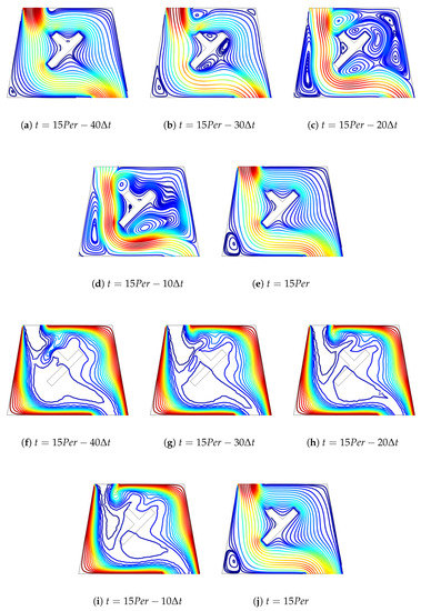 Variation of streamlines (a–e) and isotherms (f–j) in the vented cavity for various time instances within a period of the pulsating flow (Ha = 10, = 10, = 45, , , St = 0.5).