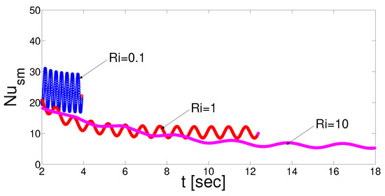 Heat transfer enhancement with pulsating flow for different values of Richardson numbers (Ha = 10, = 10, = 45, , , St = 0.5).