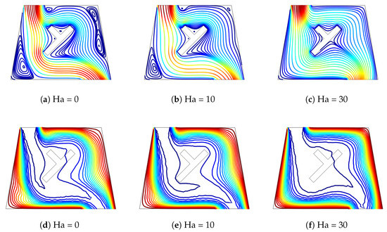 Influence of magnetic field strength on the distributions of streamlines (a–c) and isotherms (d–f) (Ri = 1, = 45, 45, ).