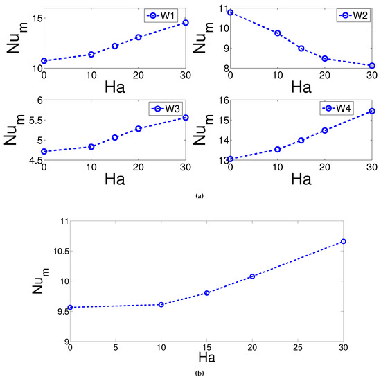 Average Nusselt number of the hot wall segments (individual (a) and total (b)) for different Hartmann numbers (Ri = 1, = 45, 45, ).