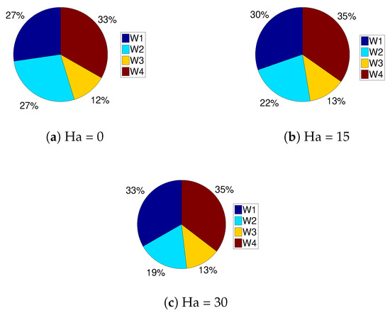 Effects of strength of uniform magnetic field on the variation of streamlines and isotherms in steady flow configuration are shown in Figure 8. In the absence of magnetic field, re-circulations near the left bottom and top right corner were formed in the vented cavity. As the strength of uniform magnetic field was increased, re-circulations in the cavity were suppressed but the fluid motion dampened as well. Clustering of the isotherms with magnetic field, especially for hot walls W1, W3 and W4, were apparent, as shown in Figure 8d–f. Average Nusselt number for those walls enhanced with magnetic field strength, as shown in Figure 9, while a reduction in the average Nusselt number was seen only for hot wall W2. The average heat transfer when taking into account all hot wall parts of the vented cavity enhanced with higher values of Hartmann number. Different hot wall segments contributed differently to the overall heat transfer rate, as shown in Figure 10. The contribution of wall W2 decreased while other wall contributions enhanced for higher Ha values.