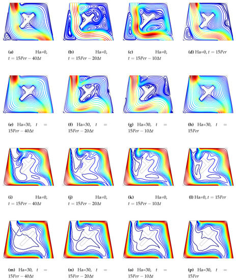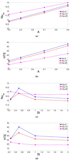 Suppression of the vortices were also seen in pulsating flow condition when magnetic field was imposed, as shown in Figure 11. The effect was influential in the cavity, expect for the regions near the T-shaped object. There were some slight variations in the spatial averaged Nusselt numbers for different magnetic field strengths, as shown in Figure 12. Enhancement of average heat transfer was seen with pulsating flow case, as shown in Table 4. There were some slight variations between the average Nu values for different Hartmann numbers in pulsating flow. However, HTE was reduced with higher values of Ha number and this could be attributed to the increment of the average Nu with magnetic field strength in the pulsating flow configuration.