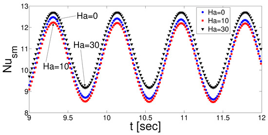 Impacts of Hartmann number on the variation of spatial averaged Nusselt number considering all hot wall in pulsating flow (Ri = 1, = 10, = 45, , , St = 0.5).