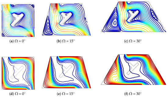 Impacts of side wall inclination angle of the vented cavity on the variation of streamlines (a–c) and isotherms (d–f) (Ri = 1, Ha = 10, 45, ).