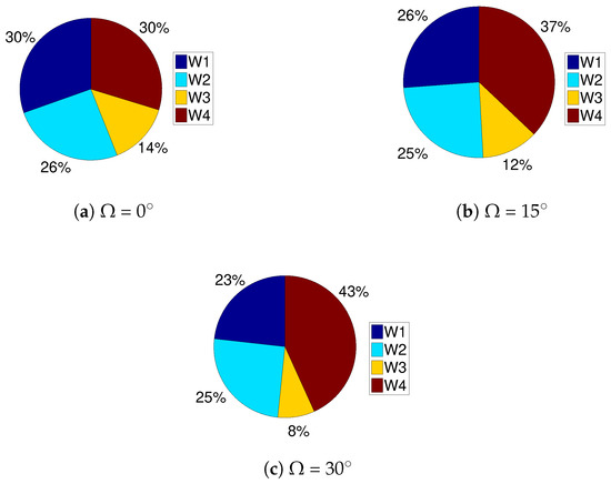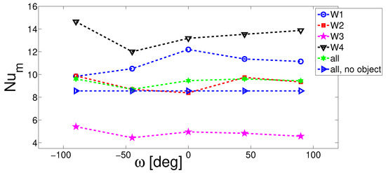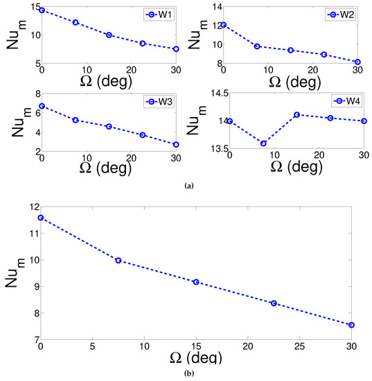 As the value of the inclination angle increased, vortices were established near the inclined surfaces below the inlet port and above the outlet port, as shown in Figure 13. Isotherms became less clustered in the regions where elongation of the walls took place and vortices were formed. The average heat transfer rate reduced for all walls except for hot wall W4 (top wall) with higher values of side wall inclination angles. Overall, the average Nu number was reduced for higher values of side wall inclination angle (Figure 14). Contributions of walls W1, W2 and W3 reduced with higher while the impact was reversed for wall W4 and the increment was the contribution to the overall heat transfer rising by about 13% when minimum and maximum values of were compared, as shown in Figure 15.