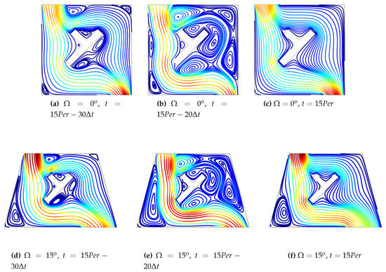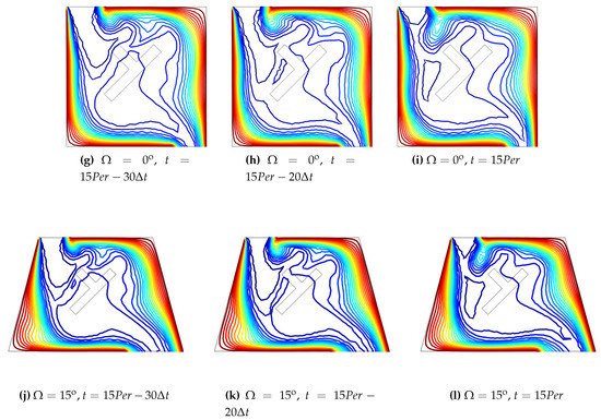 Variation of streamlines (a–f) and isotherms (g–l) in the vented cavity for various time instances within a period for two values of side wall inclination angle of the vented cavity (Ri = 1, Ha = 10, , , , St = 0.5).