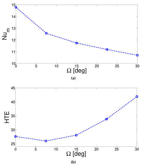 In pulsating flow, similar to steady flow configuration, vortices near the inclined walls were established and multiple re-circulation zones were also seen with different time instances within a period of flow pulsation (Figure 16). Spatial average and total average heat transfer reduced with higher values of (Figure 17). Similar to previous configurations with flow pulsations, heat transfer enhanced as compared to steady flow configuration and therefore HTE rose from 21 to 48 when was varied from 0 to 30 in pulsating flow conditions.