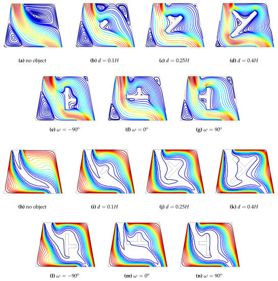 Effects of size and orientation of the T-shaped obstacle on the variation of streamlines (b–g) and isotherms (i–n) in the vented cavity (Ri = 1, Ha = 10, = 10). Streamline (a) and isotherm (h) variation in the cavity without object are also shown.