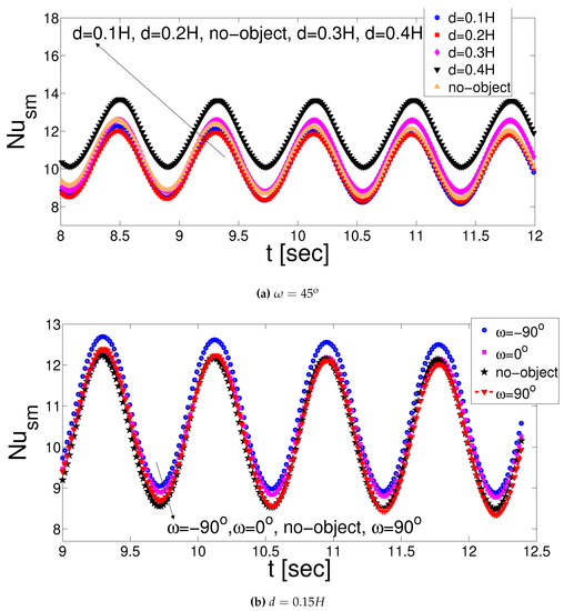 Variation of spatial averaged Nusselt number in pulsating flow for various values of size and inclination of the T-shaped object (Ri = 1, Ha = 10, = 10, , St = 0.5).