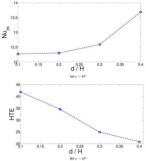 Spatial average Nusselt number increased as the size of T-shaped object increased and the variation was small when different orientations of the object were compared(Figure 21). The overall average Nusselt number increased with greater size of the T-shaped object, similar to the steady flow configuration. However, HTE value was reduced from 41.85 to 20.81 when d was increased from 0.1 H to 0.4 H (Figure 22), which was attributed to the higher Nusselt number enhancement in pulsating flow compared to the steady flow case. The impact of inclination angle of the T-shaped object is shown in Table 5. When pulsating and steady flow configurations were compared, a maximum value of HTE = 31.32 was attained. The impact of on the variation of Nu number was slight in both steady and pulsating flow cases.