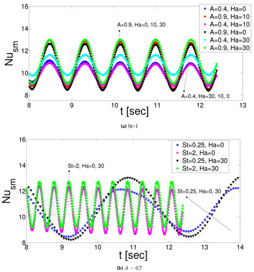 In the pulsating flow configuration, Nusselt number is time dependent. Local Nusselt number is obtained as: