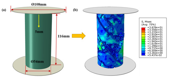 The lithology used in the simulation, through this study, is sandstone. The 3D uniaxial compression simulation is firstly carried out to calibrate and determine the property parameters of the sandstone adopted in the numerical simulation according to the uniaxial compression experiment. The FE model consists of a cylinder in the size of Ø54 mm × 116 mm and two rigid disks in the size of Ø108 mm × 0.5 mm, as shown in Figure 1a. A fully fixed constraint is applied to the lower disk and a compressive displacement load of 5 mm is applied to the upper disk which only has a z-direction degree of freedom. Finally, the sandstone undergoes the same shear fracture as in the experiment, as shown in Figure 1b.